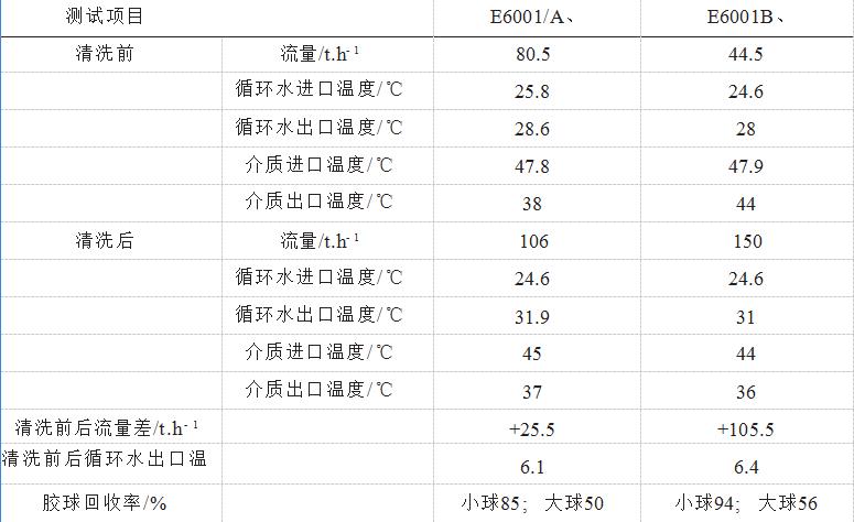 3.1此次清洗先使用Φ18mm膠球,后使用Φ20mm膠球分兩次對E6001/B、A進(jìn)行清洗,E6001/B小球的回收率為94%(投放膠球210個,回收197只)。從現(xiàn)場目測的效果看,E6001/B組的循環(huán)水管線結(jié)垢多,清洗出的懸浮物濃度高,水質(zhì)差;E6001/A循環(huán)水中的懸浮物稍少于E6001/B,其循環(huán)水質(zhì)較混。